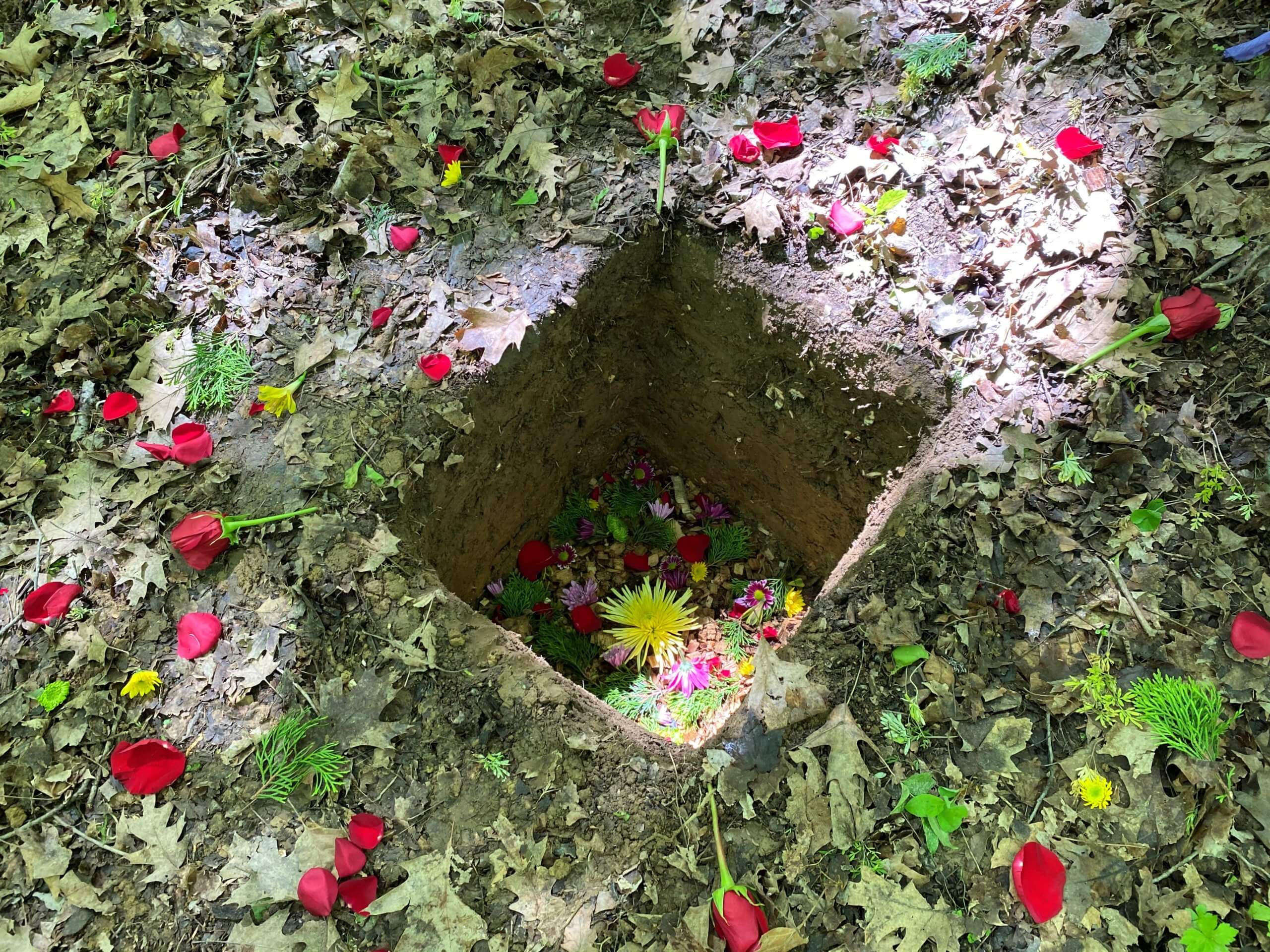 - find flowers, pine boughs, twigs, or other biomass covering the bottom of the grave to promote aeration and decay;